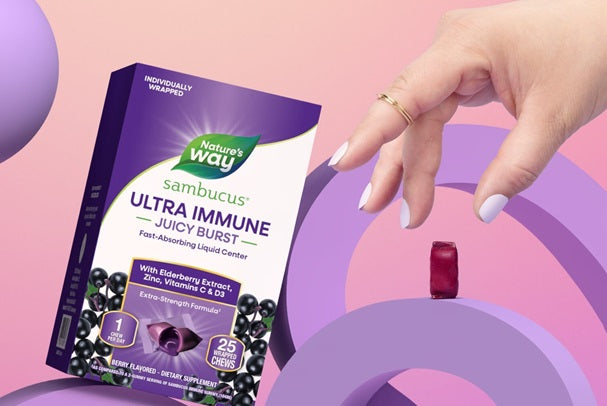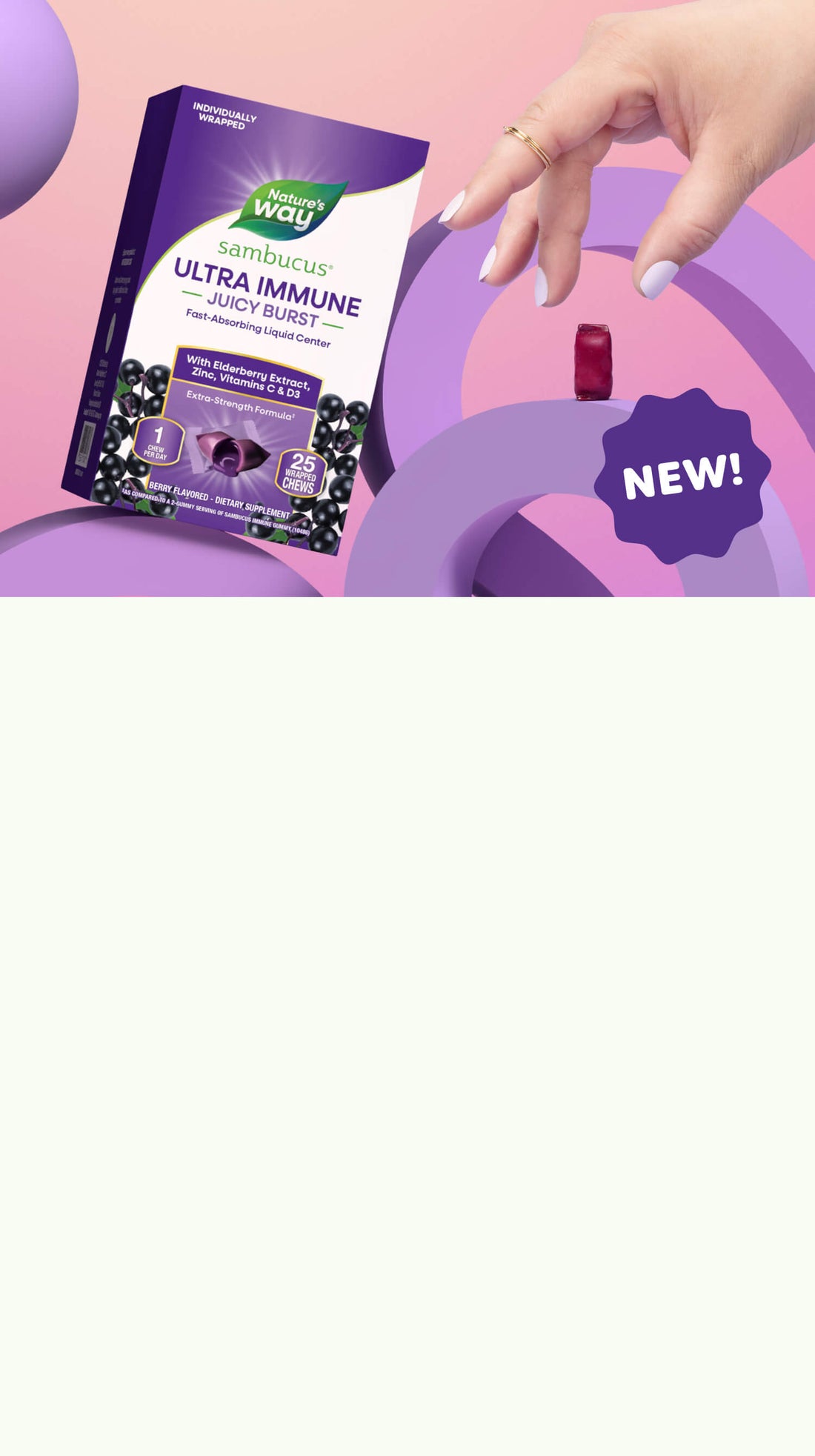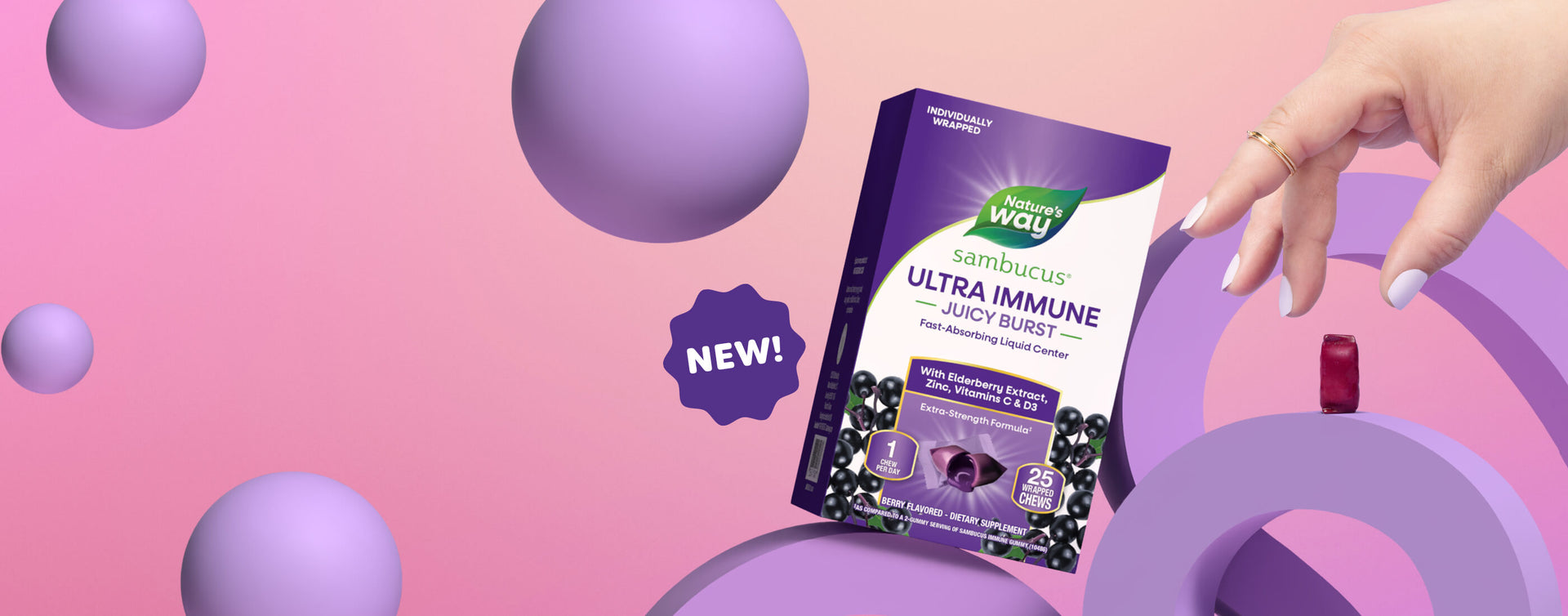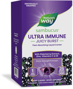 Introducing our new Sambucus Ultra Immune Juicy Burst! Immune support for the whole family in a delicious, first-of-its-kind elderberry chew.*