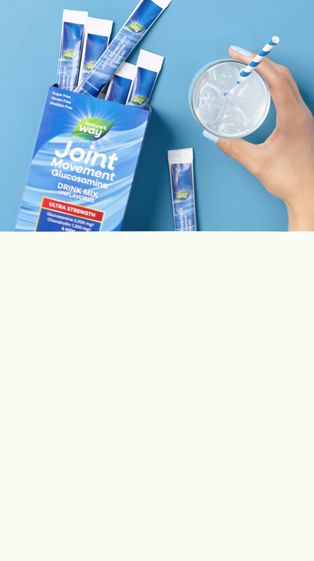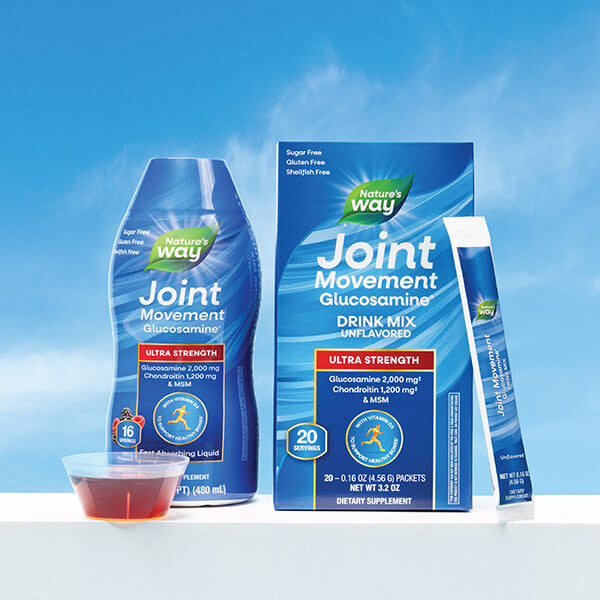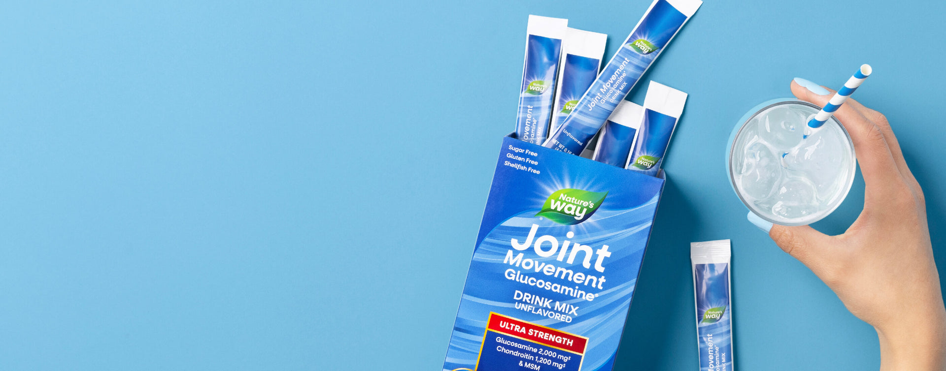 Joint Movement Glucosamine contains a variety of trusted ingredients, including 2,000 mg of glucosamineper serving and vitamin D3. Choose from a liquid supplement or powdered drink mix to support your movement, your way.